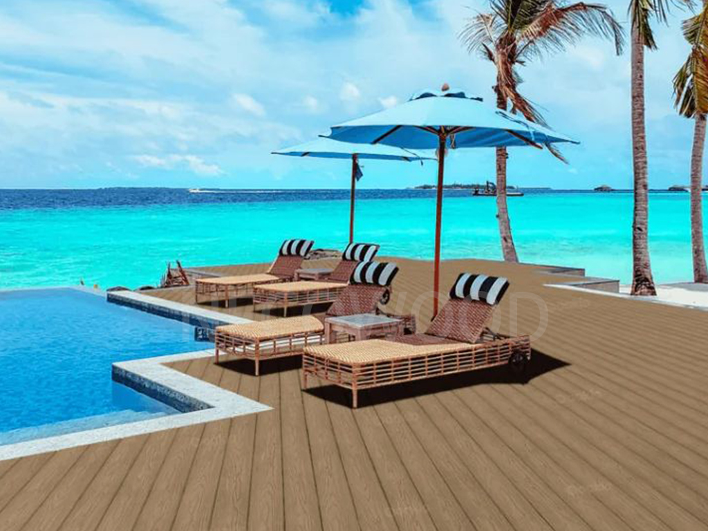 De terrasplanken van Necowood hebben een natuurlijke houtnerftextuur die UV-stralen en stralingswarmte absorbeert, waardoor schittering wordt verminderd en tegelijkertijd uitstekende drainage en ventilatie tussen de planken wordt geboden. De planken zijn perfect voor tuinen, patio's en zwembaden en combineren visuele warmte met structurele prestaties.