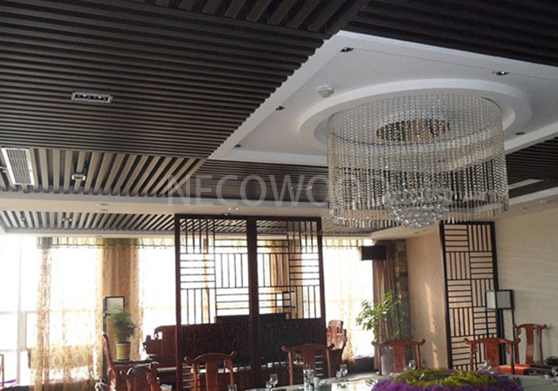Necowood-panelen bieden zowel een milieubewust ontwerp als een moderne stijl, waardoor elk plafond een gevoel van natuur en rust krijgt.